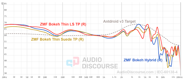 ZMF sent me a lot of pads. I had six additional pads above the default pads that come with the Bokeh, and they were primarily the Caldera-based pads. These ranged from thick to thin, suede to lambskin and different types of perforations. The default pad is the Thin Caldera Hybrid pad, which is labeled ZMF Bokeh Hybrid on my graphs.